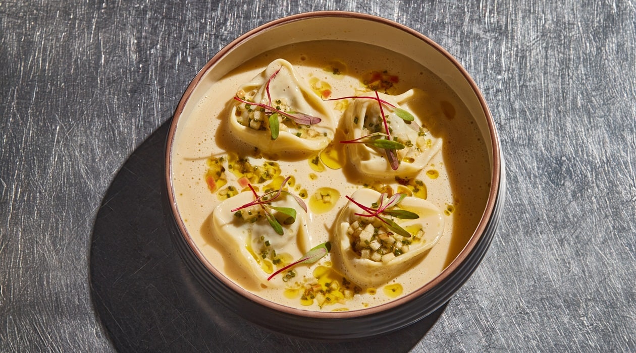 Mushroom and Black Garlic Tortellini in a Cheese Soup With Apple Salsa