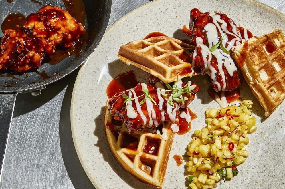 Spicy Asian-Glazed Fried Chicken & Waffles with Maple Mayonnaise